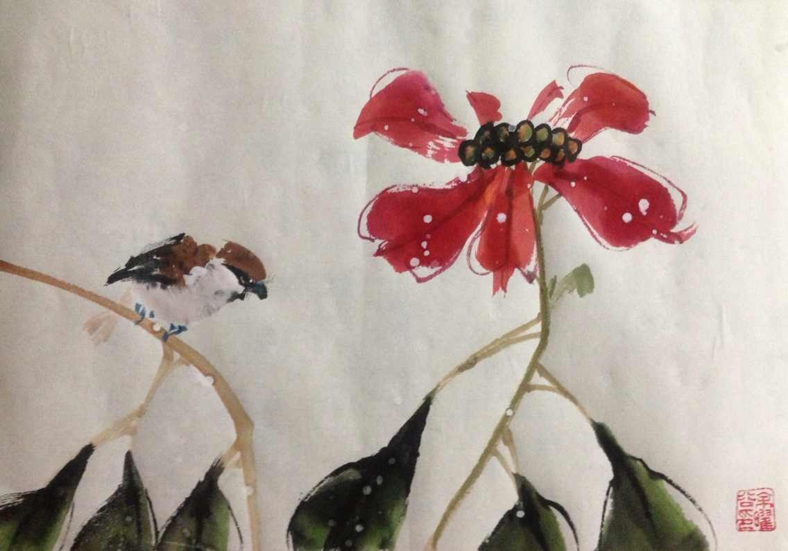 red, blue, ink, rice paper